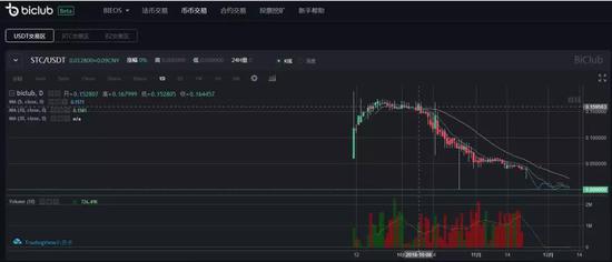 互链脉搏观察到,从10月起,在Coineal和Biclub两个交易所上线的积分星(STC)就开启了暴跌模式,目前Biclub交易所中STC基本已经归零,而在场外交易平台玩客家上,STC已从10月份的1元左右跌到0.1元。